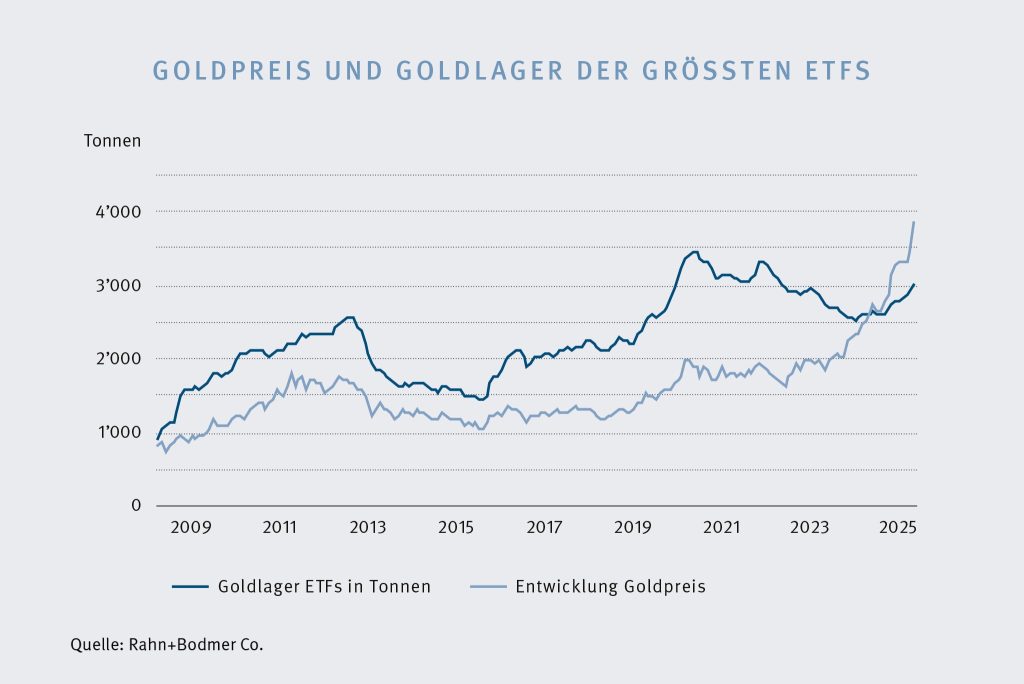 Die positiven Impulse sind vielfältig. Historisch zeigte sich eine enge, negative Korrelation zwischen Gold und den Realrenditen in den USA. Über 20 Jahre lang war dieser Mechanismus fast ein Naturgesetz und wurde mit Russlands Invasion in die Ukraine und der Einfrierung russischer Währungsreserven durch den Westen 2022 ausser Kraft gesetzt. Dies war gleichzeitig der Start von Zentralbanken, allen voran China, als strukturelle Goldkäufer, um ihre Währungsreserven zu diversifizieren. Andere historisch belegte Treiber sind die geopolitischen Unsicherheiten sowie ein schwächerer US-Dollar. Ein neues wesentliches Element der aktuellen Gold-Hausse sind Donald Trumps Druckversuche auf die US-Fed sowie die Ernennung von Stephen Miran als neues Mitglied der US-Zentralbank. Beides befeuert Spekulationen über eine mögliche Politisierung der Geldpolitik und treibt den Goldpreis ebenfalls in die Höhe.