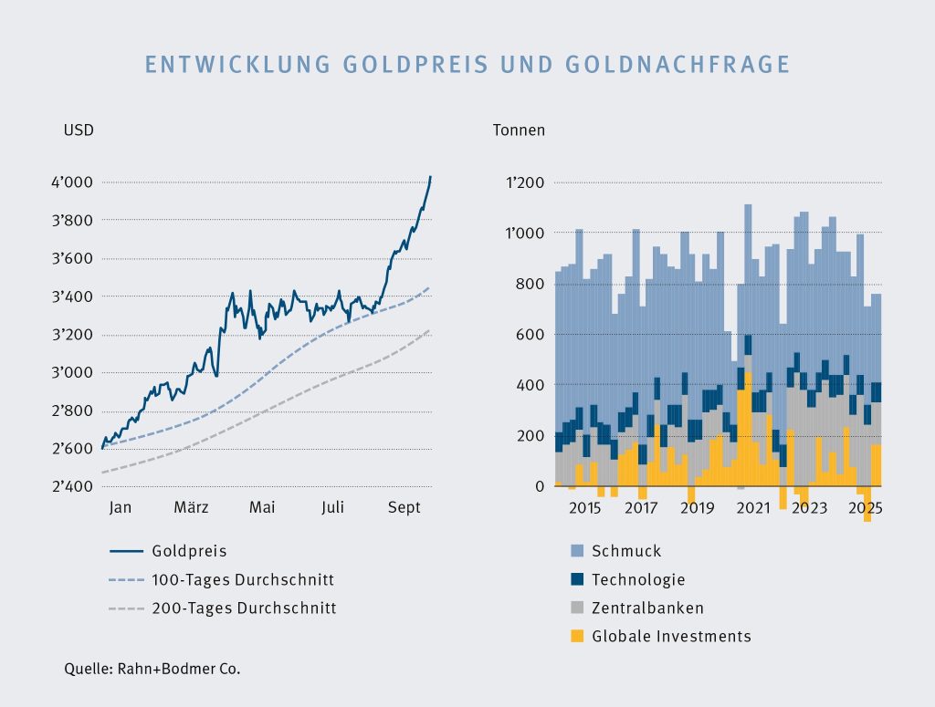 Der jüngste Preisausbruch ist unweigerlich übertrieben und eine Preiskorrektur oder Konsolidierung wäre überfällig. Eine solche versuchen zu «timen» wäre aber falsch, da der strukturelle Treiber «Zentralbanken-Käufe» weiterhin intakt ist, geopolitisch vorderhand keine friedlichere Welt erwartet wird, US-Zinssenkungen die Opportunitätskosten von Gold sinken und neben den Zentralbanken noch zyklische Investoren, wie institutionelle und private Käuferinnen und Käufer, hinzukommen könnten.